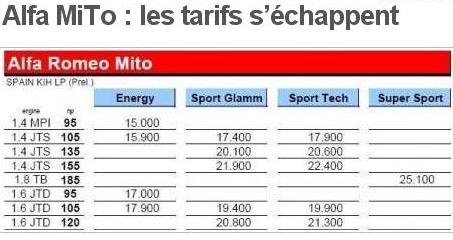 Posté le: 30 06 08 11:25 Sujet du message: Tarifs de l'Alfa MiTo |